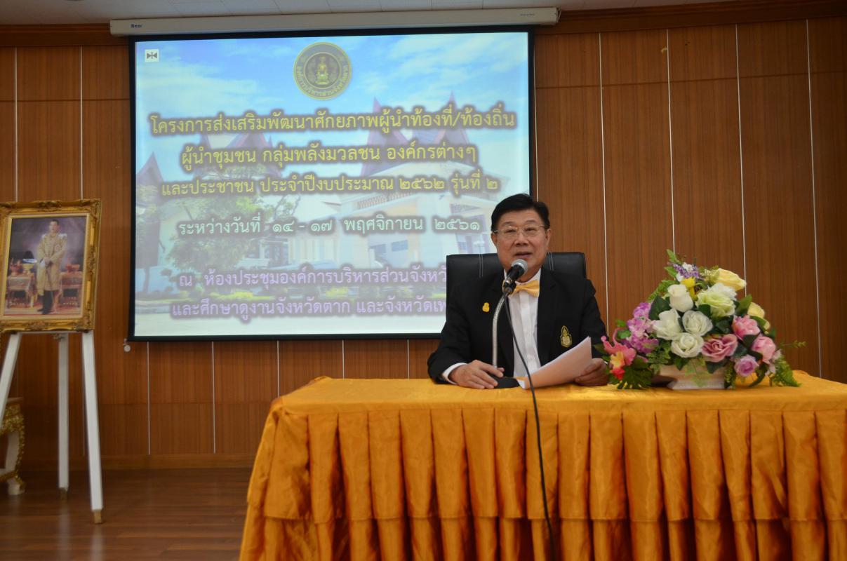 วันที่ 14 พฤศจิกายน พ.ศ.2561 นายณัฐวุฒิ ทวีเกื้อกูลกิจ นายกองค์การบริหารส่วนจังหวัดตาก เป็นประธานเปิดโครงการส่งเสริมพัฒนาศักยภาพผู้นำท้องที่/ท้องถิ่น ผู้นำชุมชน กลุ่มพลังมวลชนองค์กรต่างๆและประชาชน ประจำปีงบประมาณ พ.ศ.2562 รุ่นที่ 2 ณ ห้องประชุมองค์การบริหารส่วนจังหวัดตากและเดินทางไปศึกษาดูงานจังหวัดเพชรบุรีและจังหวัดสุพรรณบุรี โดยมีนายชัยยุทธ แสงนุช สมาชิกสภาองค์การบริหารส่วนจังหวัดตาก เขตอำเภอเมืองตาก กล่าวยรายงาน และได้รับเกียรติจาก ร.ต.สาโรช ชัยชนะ เป็นวิทยากรบรรยายให้ความรู้เรื่อง"การประยุกต์ใช้ปรัชญญาของเศรษฐกิจพอเพียง" วัตถุประสงค์ในการจัดงานครั้งนี้ เพื่อให้ความรู้ความเข้าใจเกี่ยวกับบทบาทหน้าที่ของผู้นำท้องที่/ท้องถิ่นฯ แลกเปลี่ยนเรียนรู้ประสบการณ์ความรู้ในการบริหารจัดการท้องถิ่นและสร้างความสามัคคีในท้องถิ่น มีกลุ่มเป้าหมายเป็นผู้นำท้องที่/ท้องถิ่นฯในจังหวัดตากเข้าร่วมจำนวน 90 คน