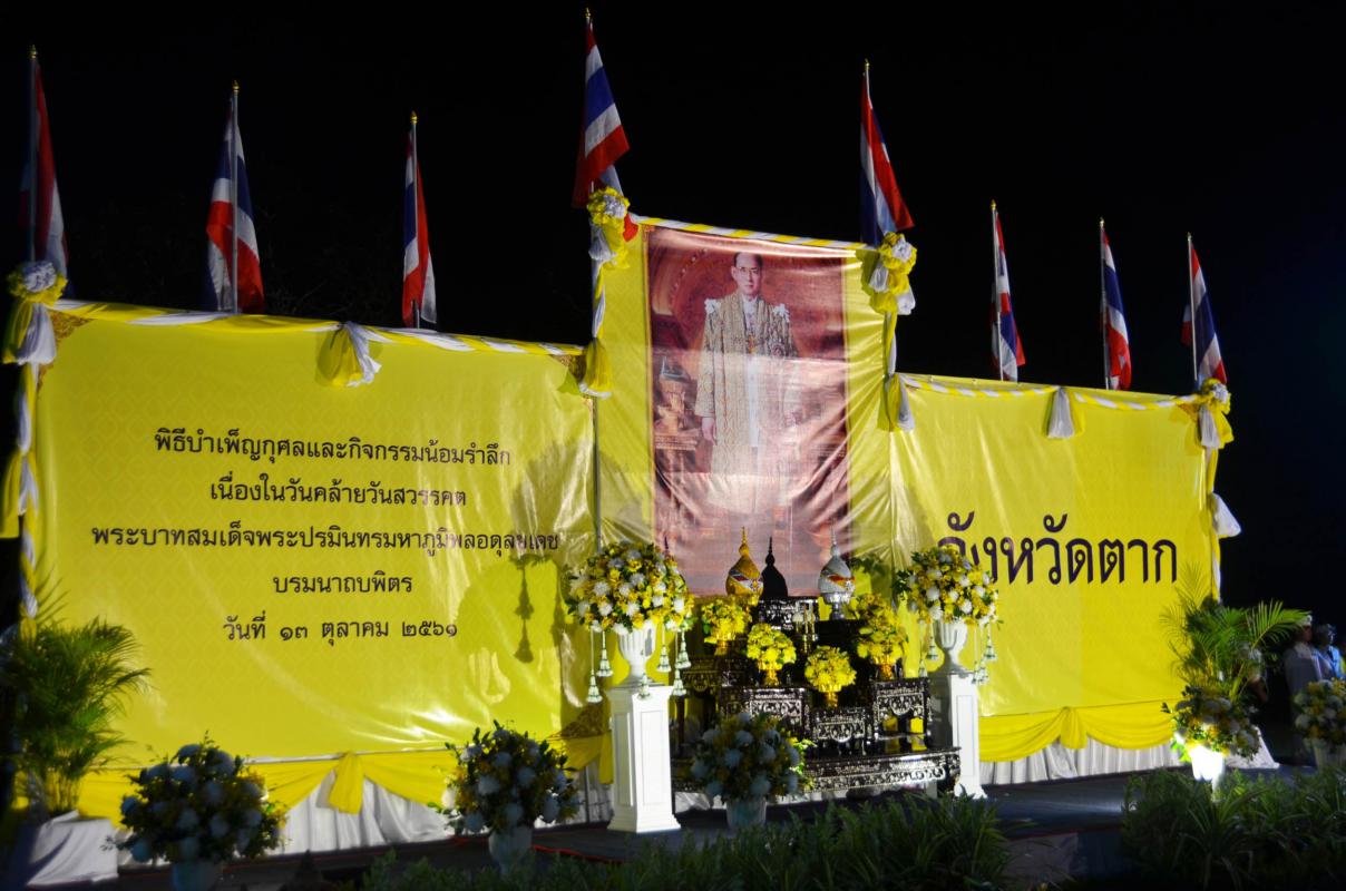 .................วันนี้ (13 ตุลาคม พ.ศ.2561) นายณัฐวุฒิ ทวีเกื้อกูลกิจ นายกองค์การบริหารส่วนจังหวัดตาก พร้อมข้าราชการ และเจ้าหน้าที่สังกัด องค์การบริหารส่วนจังหวัดตาก ร่วมพิธีจุดเทียนเพื่อน้อมรำลึกในพระมหากรุณาธิคุณ พระบาทสมเด็จพระปรมินทรมหาภูมิพลอดุลยเดช บรมนาถบพิตร ณ บริเวณหน้าศาลากลางจังหวัดตาก (หลังเก่า) อำเภอเมืองตาก จังหวัดตาก โดยมี นายเจริญฤทธิ์ สงวนสัตย์ ผู้ว่าราชการจังหวัดตาก เป็นประธานในพิธี นำผู้เข้าร่วมพิธีถวายบังคมเบื้องหน้าพระบรมฉายาลักษณ์พระบาทสมเด็จพระปรมินทรมหาภูมิพลอดุลยเดช บรมนาถบพิตร และนำกล่าวน้อมรำลึกในพระมหากรุณาธิคุณ จุดเทียน และยืนสงบนิ่ง เป็นเวลา 89 วินาที หลังจากนั้นดนตรีบรรเลง "พระผู้ทรงเป็นนิรันดร์ " อันแสดงออกถึงความจงรักภักดีและน้อมรำลึกในพระมหากรุณาธิคุณอันหาที่สุดมิได้