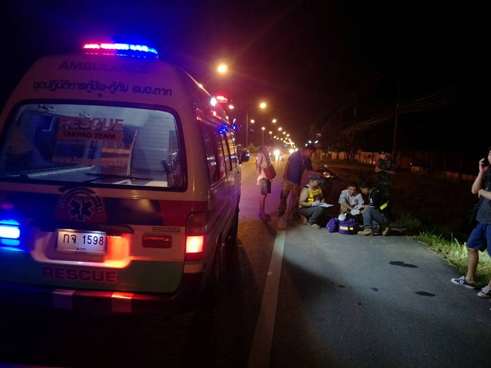 ศูนย์ป้องกันและบรรเทาสาธารณภัย อบจ.ตาก ได้รับวิทยุแจ้งจากศูนย์สั่งการตากสิน(EMS1669) ขอออกตรวจสอบรับแจ้งมีอุบัติเหตุรถจักรยานยนต์ชนท้ายรถกระบะ บนถนนจรดวิถีถ่อง บริเวณหน้าร้านไทยภูษา ตรงข้ามค่ายวชิรปราการ ตำบลน้ำรึม จึงได้จัดส่งรถพยาบาลฉุกเฉินพร้อม จนท.ชุดปฏิบัติการกู้ชีพ-กู้ภัย อบจ.ตาก รีบไปยังจุดรับแจ้ง ถึงที่เกิดเหตุพบผู้บาดเจ็บชาย 1 ราย อายุ 31 ปี ได้รับบาดแผลถลอกตามร่างกาย จึงได้ทำการปฐมพยาบาลเบื้องต้น เช็ดล้างปิดบาดแผล แต่ผู้บาดเจ็บไม่ประสงค์ไปโรงพยาบาล