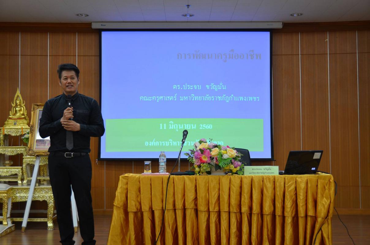 วันที่ 11 มิถุนายน 2560 องค์การบริหารส่วนจังหวัดตากจัดโครงการฝึกอบรมและพัฒนาครูและบุคลากรทางการศึกษาสู่มาตรฐานมืออาชีพ ประจำปีงบประมาณ พ.ศ.2560 ณ ห้องประชุมองค์การบริหารส่วนจังหวัดตาก โดยได้รับเกียรติจาก ดร.ประจบ ขวัญมั่น อาจารย์มหาวิทยาลัยราชภัฏกำแพงเพชร เป็นวิทยากรบรรยายให้ความรู้เรื่อง "แนวทางการฝึกฝนและพัฒนาตนเองเพื่อก้าวเข้าสู่ความเป็นครูมืออาชีพในยุคปัจจุบัน" วัตถุประสงค์ในการจัดงานครั้งนี้ เพื่อส่งเสริมให้ครูและบุคลากรทางการศึกษาในจังหวัดตาก มีความรู้ ความเข้าใจ และมีเทคนิคการจัดการเรียนการสอนสามารถปฏิบัติงานได้อย่างมีประสิทธิภาพ เต็มศักยภาพ มีความเป็นมืออาชีพ และมีความเป็นเลิศทางวิชาการ ตลอดจนส่งเสริมให้มีการเรียนรู้ที่หลากหลายเพื่อนำไปประยุกต์ใช้ในการสอน สร้างแนวคิดใหม่ มีการพัฒนาคุณภาพด้านการศึกษาเกิดการเปลี่ยนแปลงในทางที่ดีขึ้น มีคุณภาพตรงตามเกณฑ์มาตรฐาน โดยมีกลุ่มเป้าหมาย คือ ครูและบุคลากรทางการศึกษาจังหวัดตาก จำนวน 55 คน