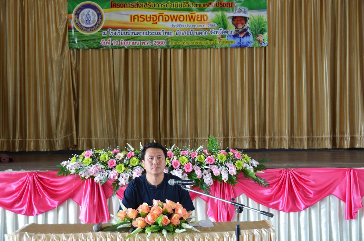 วันที่ 19 มิถุนายน 2560 นายภาคภูมิ บูลย์ประมุข รองนายกองค์การบริหารส่วนจังหวัดตาก ได้รับมอบหมายจากนายณัฐวุฒิ ทวีเกื้อกูลกิจ นายกองค์การบริหารส่วนจังหวัดตาก เป็นประธานเปิดโครงการส่งเสริมการดำเนินชีวิตตามหลักปรัชญาเศรษฐกิจพอเพียง ณ หอประชุมโรงเรียนบ้านตากประถมวิทยา อำเภอบ้านตาก จังหวัดตาก โดยมีนางสาวปาริชาติ หิรัญรัตน์ ผู้อำนวยการกองแผนและงบประมาณฯ กล่าวรายงาน วัตถุประสงค์ในการจัดงานครั้งนี้ เพื่อส่งเสริมการเพื่มรายได้ ลดรายจ่าย มุ่งเน้นให้เกษตรกรสามารถประกอบอาชีพได้อย่างยั่งยืนและใช้จ่ายเงินที่ได้มาอย่างพอเพียง มีกลุ่มเป้าหมายเป็นเกษตรกรในเขตอำเภอบ้านตากและอำเภอใกล้เคียง จำนวน 200 คน