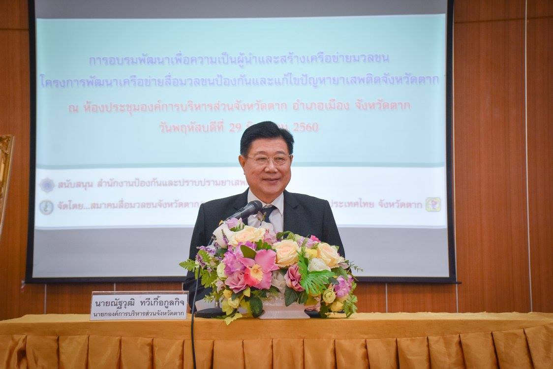 .........วันที่ 29 มิถุนายน 2560 นายณัฐวุฒิ ทวีเกื้อกูลกิจ นายกองค์การบริหารส่วนจังหวัดตาก เป็นประธานเปิดโครงการพัฒนาเครือข่ายสื่อมวลชนป้องกันและแก้ไขปัญหายาเสพติดจังหวัดตาก ณ ห้องประชุมองค์การบริหารส่วนจังหวัดตาก อำเภอเมือง จังหวัดตาก โดยงานนี้จัดโดยสมาคมสื่อมวลชนจังหวัดตาก และชมรมนักหนังสือพิมพ์ภูมิภาคแห่งประเทศไทย จังหวัดตาก ในฐานะสือมวลชนซึ่งเป็นส่วนหนึ่งของสังคม มีบทบาทสำคัญในการรณรงค์ประชาสัมพันธ์ ในเรื่องดังกล่าว จึงได้จัดโครงการนี้ขึ้น โดยมีวัตถุประสงค์เพื่อสร้างเครือข่ายมวลชนในการที่จะป้องกันและแก้ไขปัญหายาเสพติด โดยสร้างผู้นำในชุมชนที่จะป้องกันและแก้ไขปัญหายาเสพติด โดยชุมชนเอง โดยเฉพาะการคัดกรองตรวจสอบ และการบำบัดฟื้นฟู ซึ่งจะทำให้การป้องกันและแก้ไขปัญหายาเสพติดในชุมชนอย่างมีประสิทธิภาพ