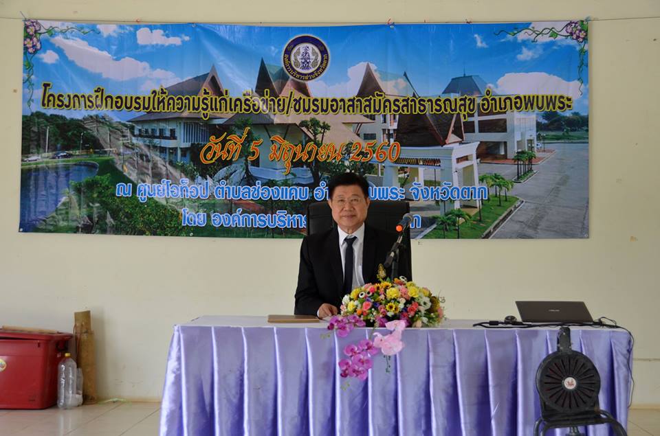 วันที่ 5 มิถุนายน 2560 นายณัฐวุฒิ ทวีเกื้อกูลกิจ นายกองค์การบริหารส่วนจังหวัดตาก เป็นประธานเปิดโครงการอบรมให้ความรู้เครือข่าย/ชมรมอาสาสมัครสาธารสุข อำเภอพบพระ ณ ศูนย์โอท็อป ตำบลช่องแคม อำเภอพบพระ จังหวัดตาก วัตถุประสงค์ในการจัดงานครั้งนี้ เพื่อเพิ่มพูนความรู้ ความเข้าใจให้กับเครือข่าย/ชมรมอาสาสมัครสาธารสุขและทำให้เกิดการมีส่วนร่วมคิดหาแนวทางสร้างแบบแผนการปฏิบัติงานร่วมกัน มีกลุ่มเป้าหมายเป็นเครือข่าย/ชมรมอาสาสมัครสาธารสุขอำเภอพบพระ จำนวน 280 คน