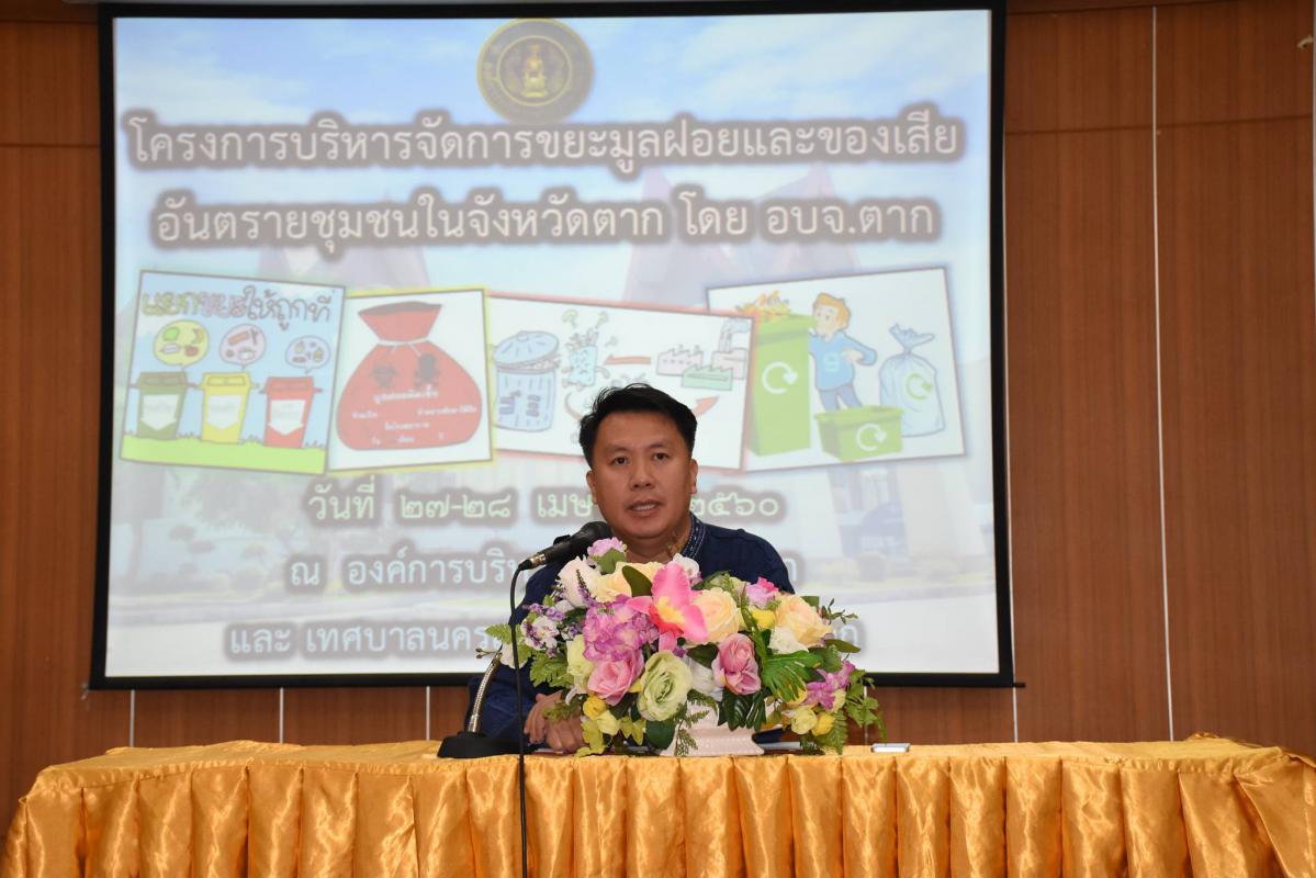 วันที่ 27 เมษายน 2560 นายภาคภูมิ บูลย์ประมุข รองนายกองค์การบริหารส่วนจังหวัดตาก ได้รับมอบหมายจากนายณัฐวุฒิ ทวีเกื้อกูลกิจ นายกองค์การบริหารส่วนจังหวัดตาก เป็นประธานเปิดโครงการบริหารจัดการขยะมูลฝอยรวมและของเสียอันตราย ประจำปีงบประมาณ พ.ศ. 2560 ณ ห้องประชุมองค์การบริหารส่วนจังหวัดตาก วัตถุประสงค์ในการจัดงานครั้งนี้ เพื่อส่งเสริมสร้างความรู้ ความเข้าใจในแก้ไขปัญหาการบริหารจัดการขยะมูลฝอยและของเสียอันตรายในจังหวัดตาก มีกลุ่มเป้าหมายเป็น เจ้าหน้าที่ อปท.ในจังหวัดตากและเจ้าหน้าที่ที่เกี่ยวข้อง จำนวน 68 คน