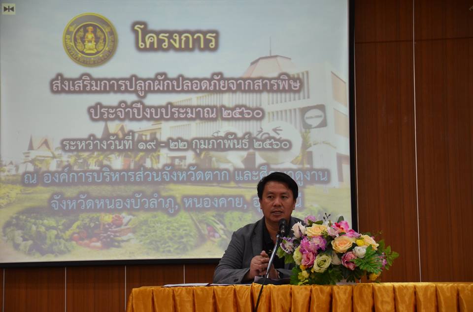 วันที่ 19 กุมภาพันธ์ 2560 นายภาคภูมิ บูลย์ประมุข รองนายกองค์การบริหารส่วนจังหวัดตาก ได้รับมอบหมายจากนายณัฐวุฒิ ทวีเกื้อกูลกิจ นายกองค์การบริหารส่วนจังหวัดตาก เป็นประธานเปิดโครงการส่งเสริมการปลูกพืชผักปลอดภัยจากสารพิษ ระหว่างวันที่ 19 - 22 กุมภาพันธ์ 2560 ณ ห้องประชุมองค์การบริหารส่วนจังหวัดตากและเดินทางไปศึกษาดูงานจังหวัดหนองบัวลำภู จังหวัดหนองคายและจังหวัดอุดรธานี โดยมีนายสงคราม มนัสสา สมาชิกสภาองค์การบริหารส่วนจังหวัดตาก เขตอำเภอเมืองตาก กล่าวรายงาน ได้รับเกียรติจากนายบุญช่วย กำเงิน นักวิชาการส่งเสริมการเกษตรชำนาญการจากสำนักงานเกษตรจังหวัดตาก มาบรรยายให้ความรู้เรื่อง"การปลูกพืชผักปลอดภัยจากพิษ" วัตถุประสงค์ในการจัดงานครั้งนี้ เพื่อให้ความรู้และส่งเสริมการใช้สารอินทรีย์ทดแทนสารพิษที่เกิดจากสารเคมีต่างๆ เพื่อสร้างทางเลือกให้กับเกษตรกรในการสร้างรายได้จากทรัพยากรที่ตนเองมี ให้เกษตรกรผู้ผลิตมีสุขภาพที่ดีและผลผลิตที่ปลอดภัยส่งต่อไปยังผู้บริโภค มีกลุ่มเป้าหมายเป็นเกษตรกรในพื้นที่อำเภอเมืองตาก จังหวัดตาก จำนวน 100 คน