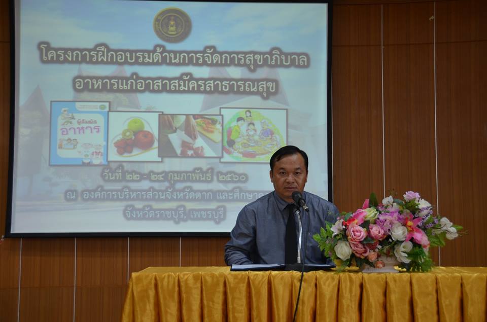 วันที่ 22 กุมภาพันธ์ 2560 นายชัชวาลย์ แสงจ้า รองนายกองค์การบริหารส่วนจังหวัดตาก ได้รับมอบหมายจากนายณัฐวุฒิ ทวีเกื้อกูลกิจ นายกองค์การบริหารส่วนจังหวัดตาก เป็นประธานเปิดโครงการฝึกอบรมด้านการจัดการสุขาภิบาลอาหารแก่อาสาสมัครสาธารณสุข ประจำปี 2560 รุ่นที่ 1 ระหว่างวันที่ 22 - 24 กุมภาพันธ์ 2560และเดินทางไปศึกษาดูงานจังหวัดราชบุรีและจังหวัดเพชรบุรี โดยมีนายธนากร นิตย์กมล สมาชิกสภา อบจ.ตาก อำเภอท่าสองยาง กล่าวรายงาน ได้รับเกียรติจากนายประวิทย์ พรมมี เจ้าพนักงานสาธารณสุขชำนาญงาน มาบรรยายให้ความรู้เรื่อง "การสุขาภิบาลอาหารเบื้องต้น" วัตถุประสงค์ในการจัดงานครั้งนี้ เพื่อเพิ่มพูนความรู้ ทักษะทางด้านวิชาการสาธารณสุขและพัฒนาศักยภาพของอสม.ในด้านสุขาภิบาลอาหารในชุมชนและสามารถนำไปปฏิบัติและแก้ไขปัญหาในชุมชนได้อย่างมีประสิทธิภาพ มีกลุ่มเป้าหมายเป็น อสม.อำเภอท่าสองยางและเจ้าหน้าที่ จำนวน 90 คน