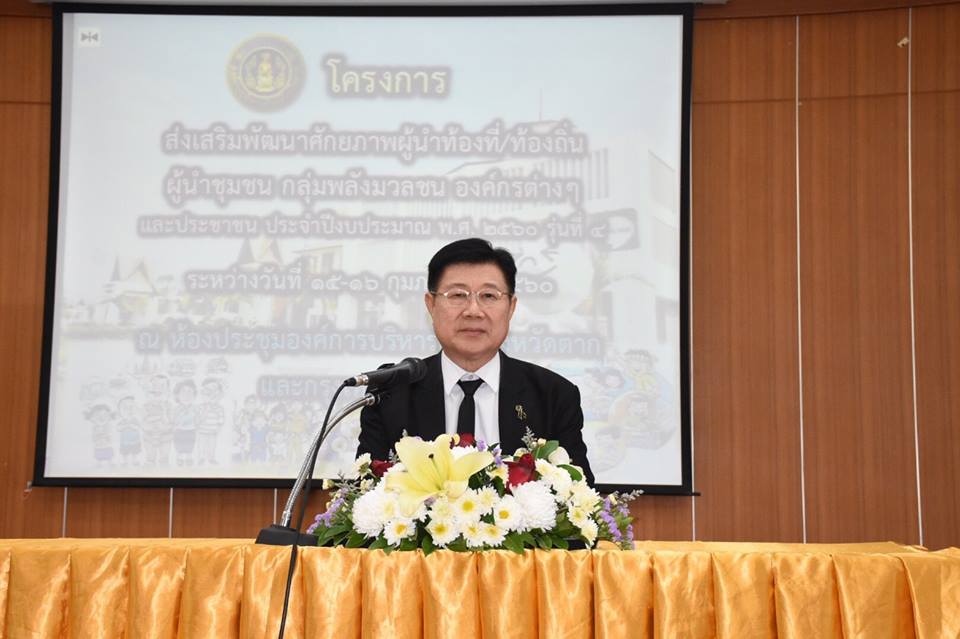 วันที่ 15 กุมภาพันธ์ 2560 นายณัฐวุฒิ ทวีเกื้อกูลกิจ นายกองค์การบริหารส่วนจังหวัดตาก เป็นประธานเปิดโครงการส่งเสริมพัฒนาศักยภาพผู้นำท้องที่/ท้องถิ่น ผู้นำชุมชน กลุ่มพลังมวลชน องค์กรต่างๆและประชาชน ประจำปีงบประมาณ พ.ศ. 2560 รุ่นที่ 4 ณ ห้องประชุม อบจ.ตาก โดยมีนายสงคราม มนัสสา สมาชิกสภาองค์การบริหารส่วนจังหวัดตาก เขตอำเภอเมืองตาก กล่าวรายงาน วัตถุประสงค์ในการจัดงานครั้งนี้ เพื่อพัฒนาความรู้ความเข้าใจให้กับผู้นำท้องที่/ท้องถิ่น ผู้นำชุมชน กลุ่มพลังมวลชน องค์กรต่างๆและประชาชนในจังหวัดตาก เกี่ยวกับระเบียบ กฎหมายด้านการบริหารจัดการสาธารณะ สิ่งแวดล้อม การจัดทำแผนชุมชน เสริมสร้างความเข้มแข็งและร่วมกันแก้ไขปัญหาและอุปสรรคในการปฏิบัติงานของ อบจ.ตาก กับผู้นำท้องที่/ท้องถิ่นต่างๆ มีกลุ่มเป้าหมายเป็นผู้ใหญ่บ้าน ผู้นำท้องที่/ท้องถิ่นต่างๆและประชาชน ในพื้นที่อำเภอเมืองตาก อำเภอแม่ระมาด จำนวน 355 คน