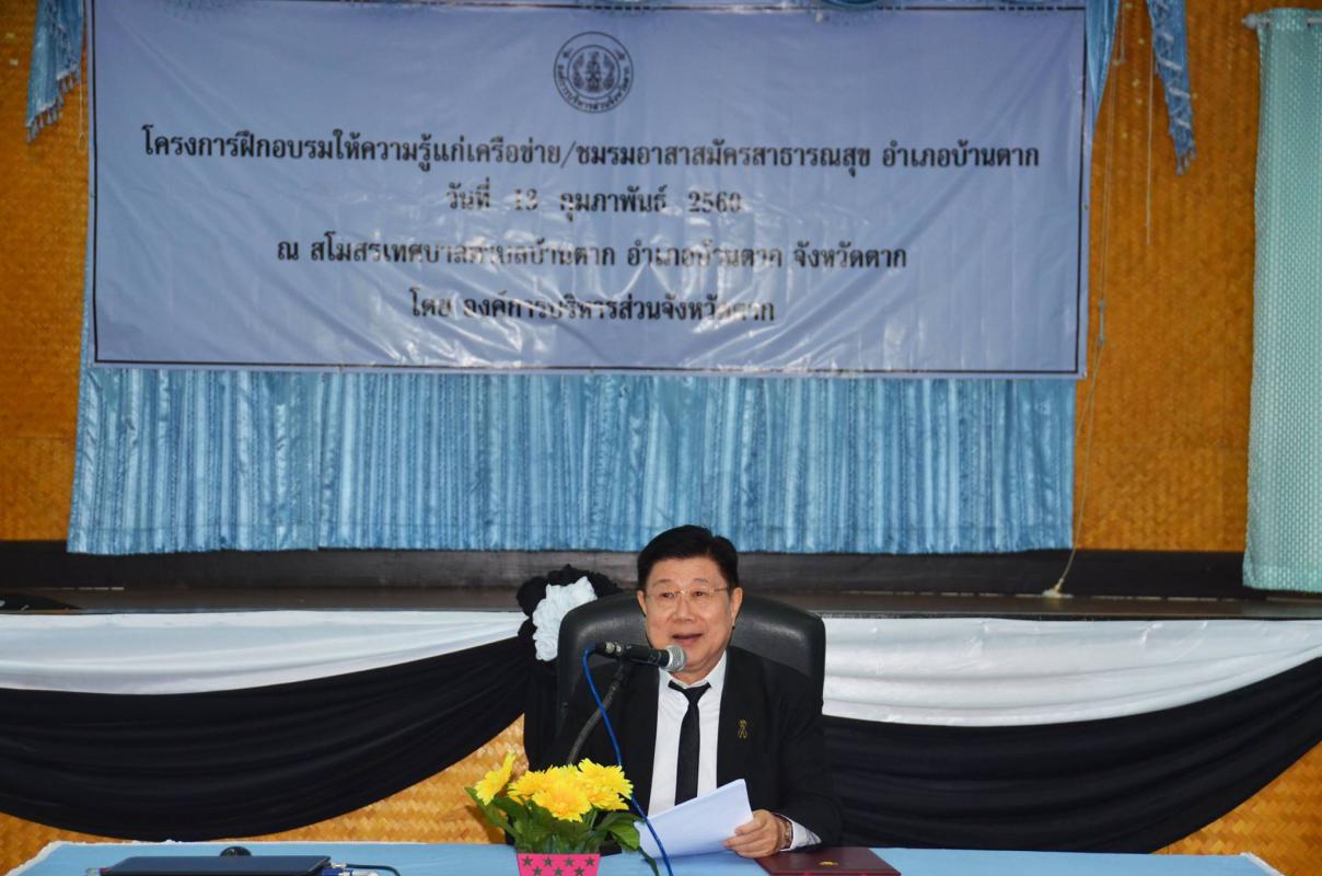 วันที่ 13 กุมภาพันธ์ 2560 นายณัฐวุฒิ ทวีเกื้อกูลกิจ นายกองค์การบริหารส่วนจังหวัดตาก เป็นประธานเปิดโครงการอบรมให้ความรู้เครือข่าย/ชมรมอาสาสมัครสาธารณสุข อำเภอบ้านตาก ณ สโมสรเทศบาลตำบลบ้านตาก อ.บ้านตาก วัตถุประสงค์ในการจัดงานครั้งนี้ เพื่อส่งเสริมทักษะ เพิ่มพูนความรู้ ความเข้าใจ ให้กับอาสาสมัครสาธารณสุขและทำให้เกิดการมีส่วนร่วมคิดหาแนวทางสร้างแบบแผนการปฏิบัติร่วมกัน โดยมีกลุ่มเป้าหมายเป็นชมรมอาสาสมัครสาธารณสุข เจ้าหน้าที่ที่เกี่ยวข้องในงานสาธารณสุขและเครือข่ายอาสาสมัครสาธารณสุขอำเภอบ้านตาก จำนวน 240 คน