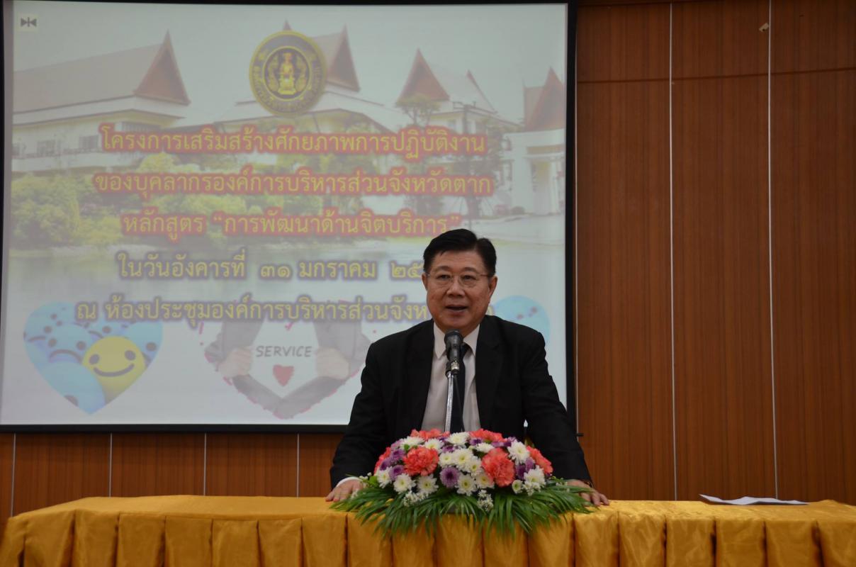 วันที่ 31 มกราคม 2560 นายณัฐวุฒิ ทวีเกื้อกูลกิจ นายกองค์การบริหารส่วนจังหวัดตาก เป็นประธานเปิดโครงการเสริมสร้างศักยภาพการปฏิบัติงานของบุคลากรองค์การบริหารส่วนจังหวัดตาก หลักสูตร "การพัฒนาด้านจิตบริการ" ณ ห้องประชุมองค์การบริหารส่วนจังหวัดตาก โดยงานนี้ได้รับความกรุณาจากพระครูประทีปจันทรังษี เป็นวิทยากรให้ความรู้ เรื่อง "การพัฒนาด้านจิตบริการของบุคลากรสังกัด อบจ.ตาก" มีข้าราชการ พนักงานจ้างและลูกจ้างเข้าร่วมจำนวน 200คน