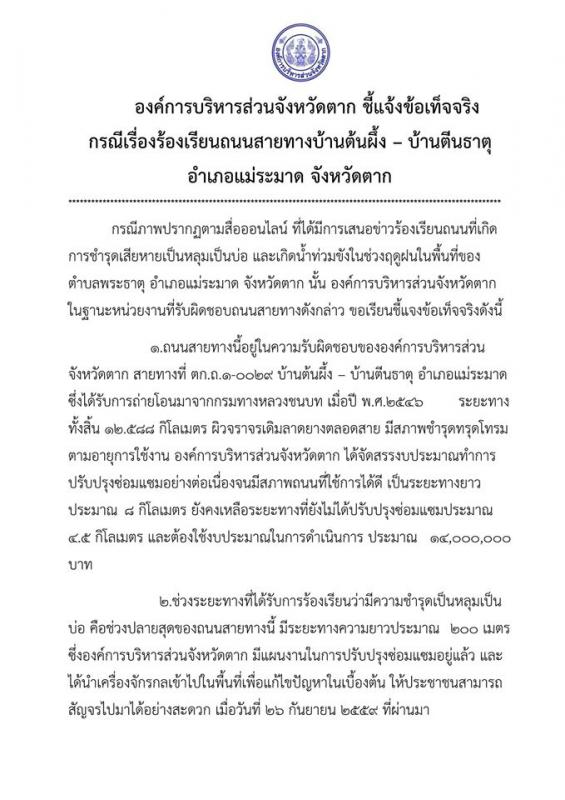องค์การบริหารส่วนจังหวัดตาก ชี้แจ้งข้อเท็จจริง กรณีเรื่องร้องเรียนถนนสายทางบ้านต้นผึ้ง – บ้านตีนธาตุ อาเภอแม่ระมาด จังหวัดตาก