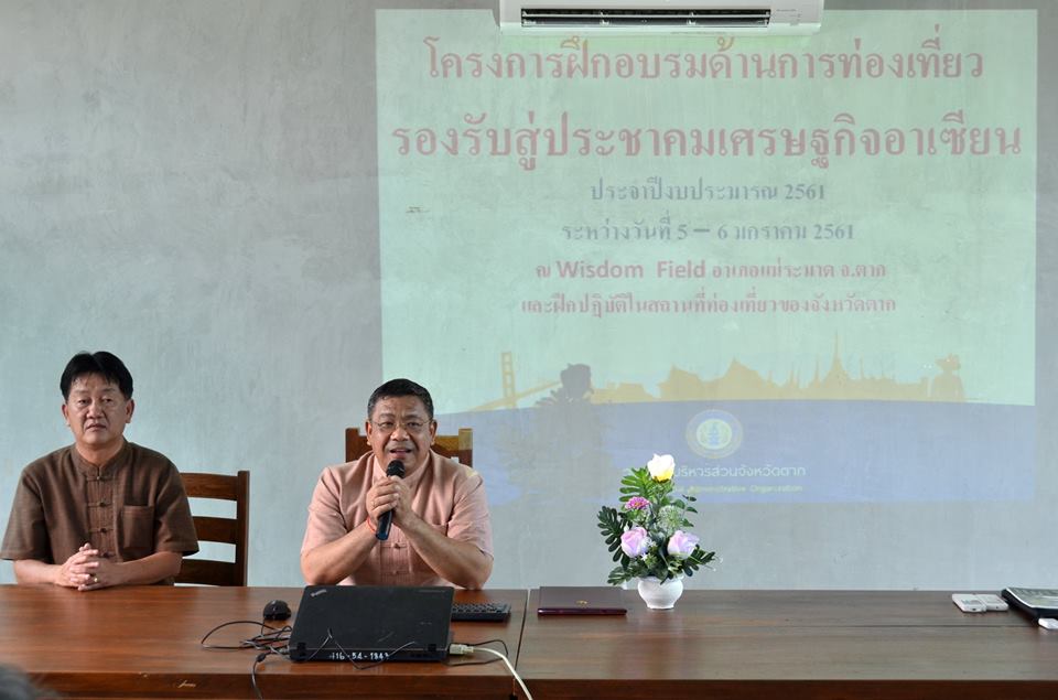 วันที่ 5 มกราคม พ.ศ.2561 นายภาคภูมิ บูลย์ประมุข รองนายกองค์การบริหารส่วนจังหวัดตาก ได้รับมอบหมายจากนายณัฐวุฒิ ทวีเกื้อกูลกิจ นายกองค์การบริหารส่วนจังหวัดตาก ร่วมพิธีเปิดโครงการจัดฝึกอบรมด้านบริการการท่องเที่ยวรองรับสู่ประชาคมเศรษฐกิจอาเซียน ณ ห้องประชุม Wisdom Field อำเภอแม่ระมาด จังหวัดตาก โดยได้รับเกียรติจากนายเจริญฤทธิ์ สงวนสัตย์ ผู้ว่าราชการจังหวัดตาก เป็นประธานเปิดโครงการ