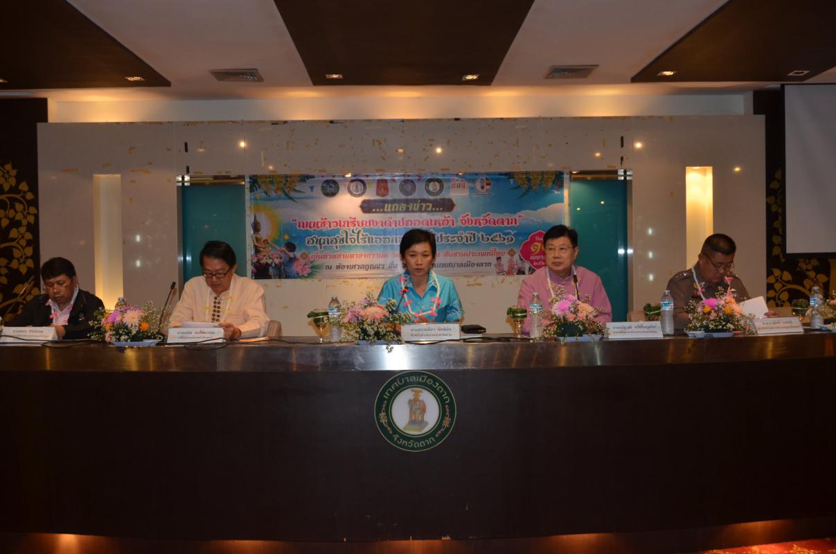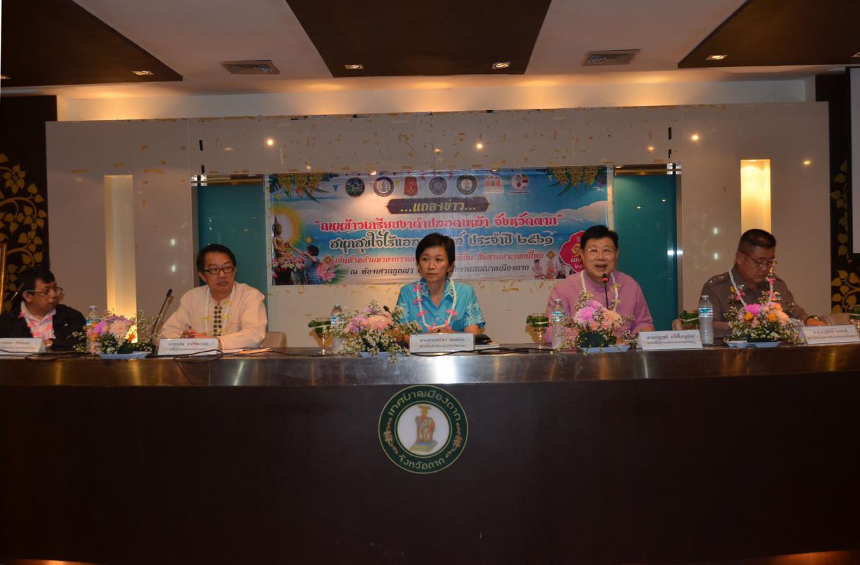 วันที่ 10 เมษายน พ.ศ.2561 นายณัฐวุฒิ ทวีเกื้อกูลกิจ นายกองค์การบริหารส่วนจังหวัดตากพร้อมนายธัชชัย ศรีสวัสดิ์ ปลัดองค์การบริหารส่วนจังหวัดตากและข้าราชการ สังกัด อบจ.ตาก ร่วมแถลงข่าวงาน "เย็นทั่วหล้ามหาสงกรานต์ วิถีชุมชน วิถีถิ่น สืบสานประเพณีไทย ถนนข้าวเกรียบงาดำปลอดเหล้า สนุกสุขใจไร้แอลกอฮอล์ ประจำปี 2561" ณ ห้องเศวตกุญชร สำนักงานเทศบาลเมืองตาก อำเภอเมืองตาก โดยมีนางสาวธนียา นัยพินิจ หัวหน้าสำนักงานจังหวัดตาก เป็นประธานในพิธี