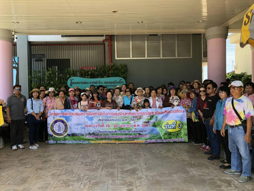 วันที่ 21 เมษายน พ.ศ.2561 คณะผู้เข้ารับการอบรมโครงการสร้างจิตสำนึกในการอนุรักษ์ทรัพยากรธรรมชาติและสิ่งแวดล้อม รุ่นที่ 3 ศึกษาดูงานตามรอยพ่อ ชมวิถีพอเพียงที่โครงการชั่งหัวมันในพระราชดำริ ตำบลเขากระปุก อำเภอท่ายาง จังหวัดเพชรบุรี และช่วงบ่าย เข้าศึกษาดูงานที่โครงการศึกษาวิจัยและพัฒนาสิ่งแวดล้อมแหลมผักเบี้ยอันเนื่องมาจากพระราชดำริ อำเภอบ้านแหลม จังหวัดเพชรบุรี
