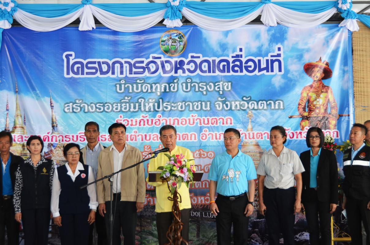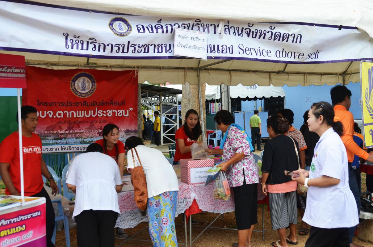 วันที่ 22 สิงหาคม พ.ศ.2561 ฝ่ายประชาสัมพันธ์ องค์การบริหารส่วนจังหวัดตาก นำกิจกรรมโครงการ “ประชาสัมพันธ์เคลื่อนที่ อบจ.ตาก พบประชาชน” ออกหน่วยเผยแพร่ประชาสัมพันธ์ข้อมูลข่าวสาร ให้กับประชาชนตามโครงการจังหวัดเคลื่อนที่ "บำบัดทุกข์บำรุงสุข สร้างรอยยิ้มให้ประชาชนจังหวัดตาก" ประจำเดือนสิงหาคม 2561 ณ องค์การบริหารส่วนตำบลตากตก หมู่ที่ 5 ตำบลตากตก อำเภอบ้านตาก จังหวัดตาก โดยการนี้ อบจ.ตาก ได้นำผลการดำเนินงาน ความรู้เกี่ยวกับ พรบ.ข้อมูลข่าวสารฯ รวมทั้ง วารสาร แผ่นพับ เอกสารที่ให้ความรู้ในเรื่องต่างๆ ที่เป็นประโยชน์แก่ประชาชน กิจกรรมการเล่นเกมส์ ตอบคำถาม รับฟังความคิดเห็นจากประชาชน เพื่อให้ให้ประชาชนที่เข้าร่วมกิจกรรม ได้รับรู้ข่าวสาร และ เข้าใจในบทบาทอำหนาจหน้าที่ของ อบจ.ตาก มากยิ่งขึ้น โดยมีนายสุวพงษ์ กิติภัทย์พิบูลย์ รองผู้ว่าราชการจังหวัดตาก เป็นประธานในพิธี ซึ่งมีหน่วยงานต่างๆ มาร่วมออกร้านให้บริการแก่ประชาชนเป็นจำนวนมาก สามารถสร้างความสุข และรอยยิ้มให้กับพี่น้องประชาชนในพื้นที่อำเภอบ้านตากได้อย่างแท้จริง