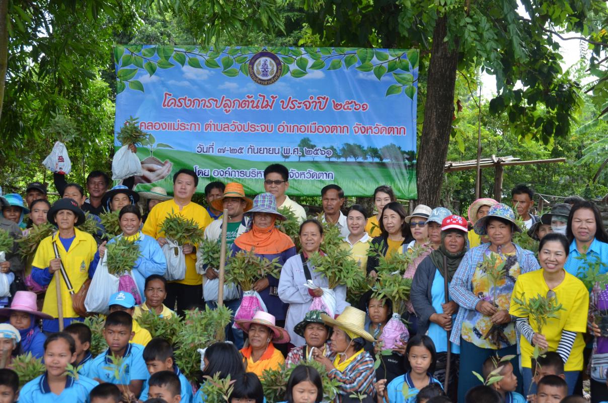วันที่ 7 กันยายน พ.ศ.2561 นายภาคภูมิ บูลย์ประมุข รองนายกองค์การบริหารส่วนจังหวัดตาก ได้รับมอบหมายจากนายณัฐวุฒิ ทวีเกื้อกูลกิจ นายกองค์การบริหารส่วนจังหวัดตาก เป็นประธานเปิดโครงการปลูกต้นไม้ ประจำปีงบประมาณ พ.ศ. 2561 ระหว่างวันที่ 7 - 25 กันยายน 2561 ณ คลองแม่ระกา ตำบลวังประจบ อำเภอเมืองตาก วัตถุประสงค์ของโครงการ เพื่อรณรงค์การลดภาวะโลกร้อนด้วยการปลูกต้นไม้ตลอดจนเพื่อสร้างความตระหนักในการอนุรักษ์ทรัพยากรธรรมชาติและสิ่งแวะล้อมให้แก่นักเรียน และประชาชน มีกลุ่มเป้าหมายเป็นประชาชน และนักเรียน ในเขตพื้นที่ เข้าร่วมจำนวน 100 คน