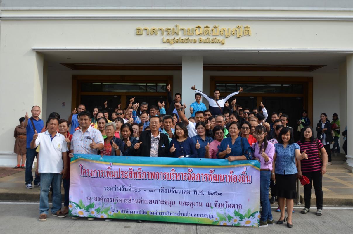 วันที่ 14 ธันวาคม พ.ศ.2561 นางวันทนา วิรัชเกษม รองปลัดองค์การบริหารส่วนจังหวัดตาก พร้อมเจ้าหน้าที่ องค์การบริหารส่วนจังหวัดตาก ได้รับมอบหมายจากนายณัฐวุฒิ ทวีเกื้อกูลกิจ นายกองค์การบริหารส่วนจังหวัดตาก ให้การต้อนรับคณะศึกษาดูงานจาก องค์การบริหารส่วนตำบลเกาะขนุน อำเภอพนมสารคาม จังหวัดฉะเชิงเทรา ณ ห้องประชุมสภาองค์การบริหารส่วนจังหวัดตาก ตามโครงการเพิ่มประสิทธิภาพการบริหารจัดการพัฒนาท้องถิ่น มีคณะศึกษาดูงาน จำนวน 100 คน ในโอกาสนี้องค์การบริหารส่วนจังหวัดตาก ได้นำเสนอและบรรยายในเรื่องการบริหารจัดการตามหลักธรรมาภิบาลและการบริหารกิจการบ้านเมืองที่ดี ซึ่งเป็นแนวทางที่องค์การบริหารส่วนจังหวัดตากยึดถือปฏิบัติ เพื่อประโยชน์และความสุขของประชาชน