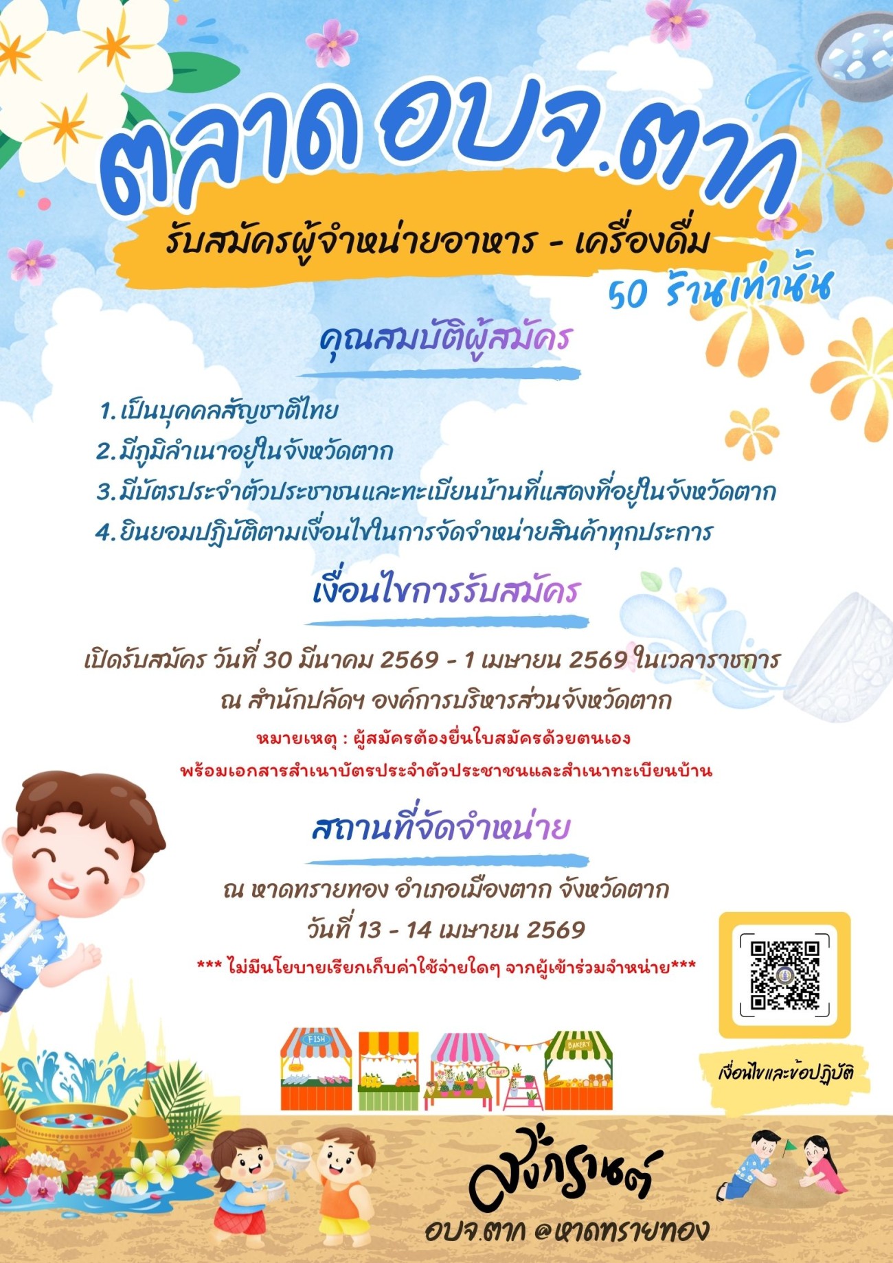 อบจ.ตาก เปิดรับสมัครผู้จำหน่ายอาหารและเครื่องดื่ม โซนตลาด อบจ.ตาก