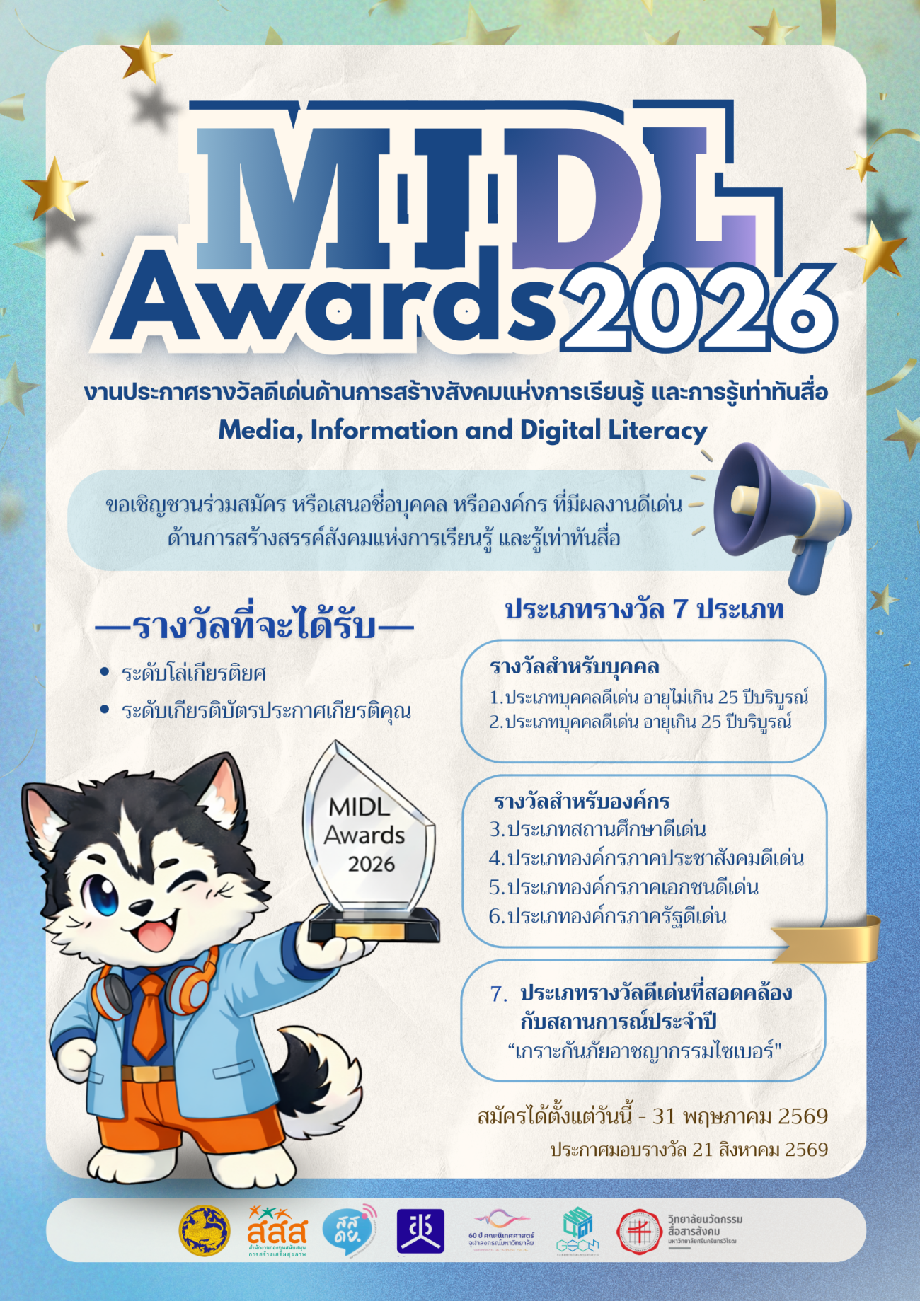ผลงานของคุณช่วยสร้าง “สังคมแห่งการเรียนรู้ และการรู้เท่าทันสื่อ” ใช่ไหม? ไม่ว่าจะเป็นบุคคลทั่วไป สถานศึกษา หรือองค์กร นี่คือโอกาสทองของคุณ เพื่อคว้าโล่เกียรติยศและเกียรติบัตรประกาศเกียรติคุณ