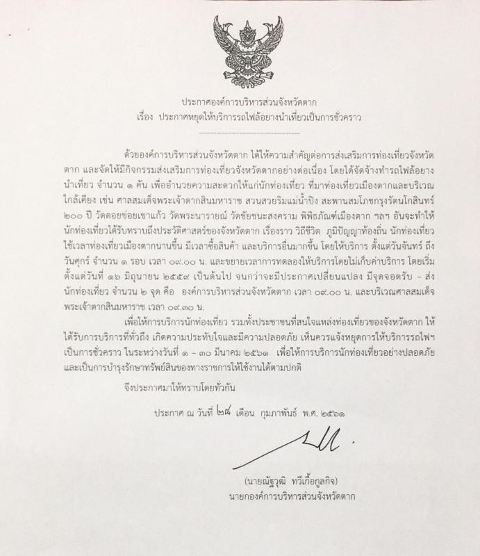 ด้วยองค์การบริหารส่วนจังหวัดตาก เห็นควรแจ้งหยุดการให้บริการรถไฟฯเป็นการชั่วคราว ในระหว่างวันที่ 1 - 30 มีนาคม 2561 เพื่อให้การบริการนักท่องเที่ยวอย่างปลอดภัยและเป็นการบำรุงรักษาทรัพย์สินของทางราชการให้ใช้งานได้ตามปกติ