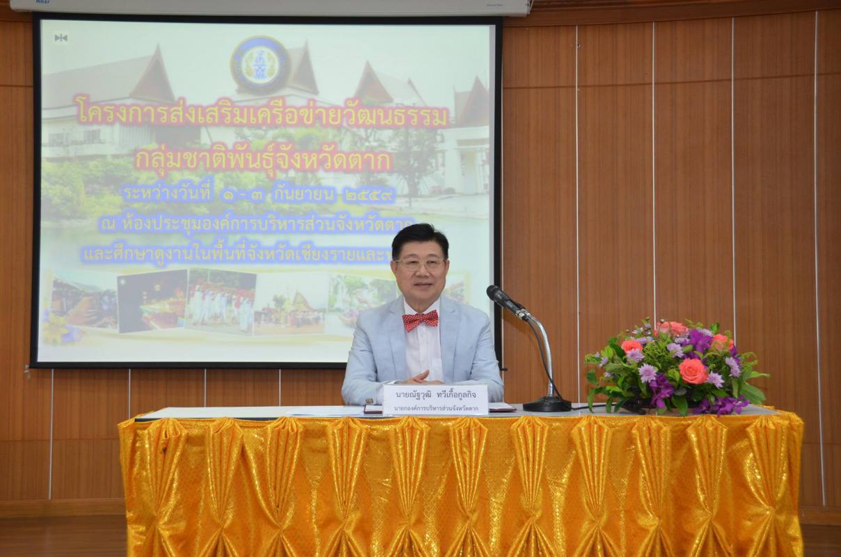 วันที่ 1 กันยายน 2559 นายณัฐวุฒิ ทวีเกื้อกูลกิจ นายกองค์การบริหารส่วนจังหวัดตากพร้อมคณะผู้บริหารองค์การบริหารส่วนจังหวัดตากและสมาชิกสภาองค์การบริหารส่วนจังหวัดตาก ร่วมโครงการส่งเสริมเครือข่ายวัฒนธรรมกลุ่มชาติพันธุ์จังหวัดตาก ประจำปี 2559 ระหว่างวันที่ 1-3 กันยายน พ.ศ. 2559 ณ ห้องประชุมอบจ.ตากและศึกษาดูงานด้านวัฒนธรรมกลุ่มชาติพันธ์ ณ จังหวัดเชียงรายและจังหวัดพะเยา โดยมีนายชัชวาลย์ แสงจ้า รองนายก อบจ.ตาก กล่าวรายงาน และได้รับเกียรติจากนางสาวขวัญใจ ตันจันทร์และนางสาวอ้อมอรุณ คำแสน วิทยากรจากสำนักงานวัฒนธรรมจังหวัดตากบรรยายข้อมูลเรื่อง "ความหลากหลายทางด้านวัฒนธรรมของกลุ่มชาติพันธุ์จังหวัดตาก" โดย อบจ.ตากได้ริเริ่มจัดตั้งสมาพันธ์ชาติพันธุ์จังหวัดตาก ขึ้นเมื่อวันที่ 30 สิงหาคม 2556 มาจนถึงปัจจุบันเป็นระยะเวลา 4ปีเพื่อให้กลุ่มชาติพันธุ์ต่างๆ ทั้ง 12กลุ่มได้นำวัฒนธรรมอันดีงามของตนมาเผยแพร่แลกเปลี่ยนเรียนรู้วัฒนธรรมที่ดีงามต่อกันและกัน ตลอดจนนำไปถ่ายทอดสู่ชนรุ่นหลังให้มีความรักและหวงแหนวัฒธรรมของแต่ละท้องถิ่น และร่วมสืบสานให้คงอยู่เป็นมนต์เสน่ห์ของจังหวัดตากต่อไป
