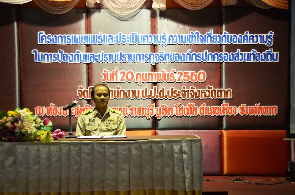 วันที่ 20 กุมภาพันธ์ 2560 นายธัชชัย ศรีสวัสดิ์ ปลัดองค์การบริหารส่วนจังหวัดตาก ได้รับมอบหมายจากนายณัฐวุฒิ ทวีเกื้อกูลกิจ นายกองค์การบริหารส่วนจังหวัดตาก เข้าร่วมโครงการเผยแพร่และประเมินความรู้ความเข้าใจเกี่ยวกับองค์ความรู้ในการป้องกันและปราบปรามการทุจริตขององค์กรปกครองส่วนท้องถิ่น จัดโดยสำนักงานป.ป.ช. ประจำจังหวัดตาก ณ โรงแรมราชาบุรีบูติคโฮเท็ล อำเภอเมืองตาก โดยมีนายวสันต์ ชำนาญจุ้ย รองผู้ว่าราชการจังหวัดตากเป็นประธานเปิดโครงการฯ